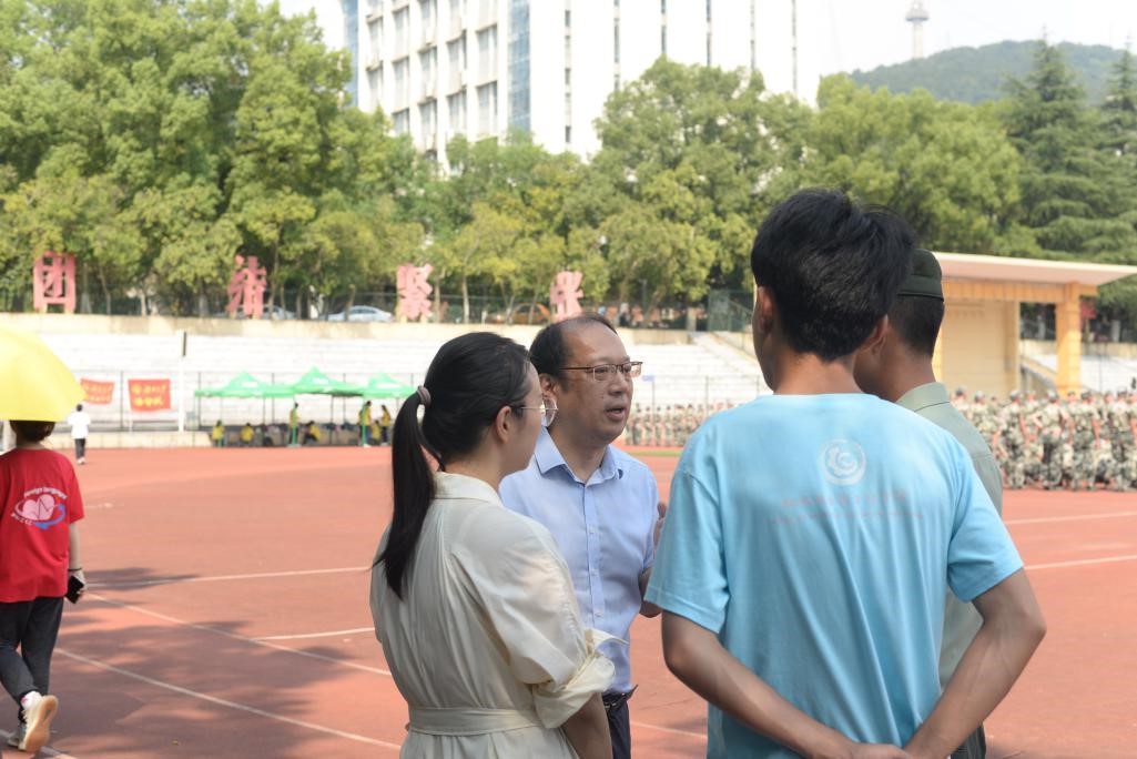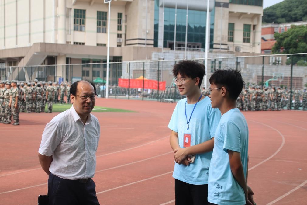 易洪波老师每天都来到大操场,和同学老师们交流谈心,认真了解军训的情况和进展。