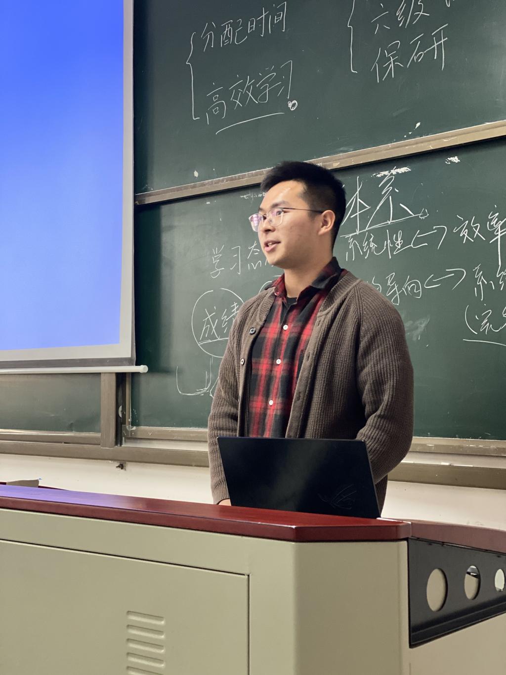 祝晓龙学长引用最近两会中习近平总书记的话,从宏观的角度告诉我们要在本科阶段打好基础、打牢基础。思维层次不能只限于目前课程学习上,而是要将视野放长远,面向国家、社会的重大需求。同时,他通过自己本科时的例子跟我们说明了做好计划的重要性,要把每一件事都做深做透,切忌广而不精,泛而不深。最后,他送给我们一句祝愿:“脚踏实地,仰望星空。”