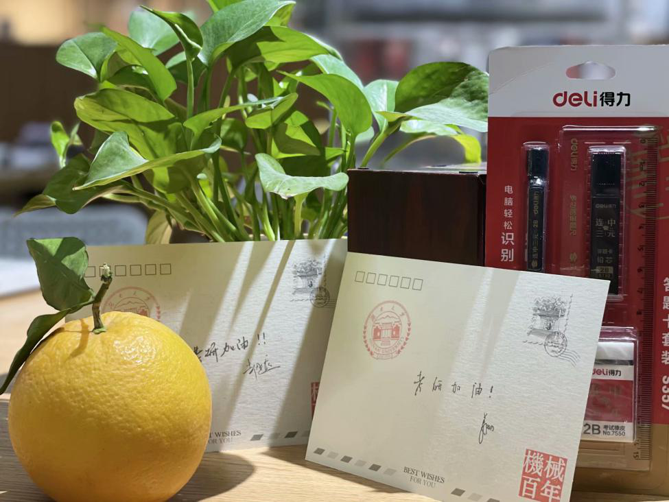 活动当晚,二百多位考研学子在晚上9:00至10:30陆续在天马一区二栋宿舍门口领取属于他们的暖心小礼物。每份礼品分别由一个脐橙、一张明信片和一套文具组成,硕大饱满的脐橙寓意考研“橙”功,祝福同学们前“橙”似锦;明信片是由机械院书记彭晓燕和院长姜潮亲笔写下的考研祝福,小小的明信片,承载着院领导和老师们亲切的关怀和真挚的慰问,预祝考研学子们金榜题名;一套文具则是希望同学们在倒计时一个月里调整好心态,劳逸结合,平稳度过最后的冲刺阶段,万事“具”备,势“笔”成功,以饱满的热情,放松的心情迎接即将到来的考试。