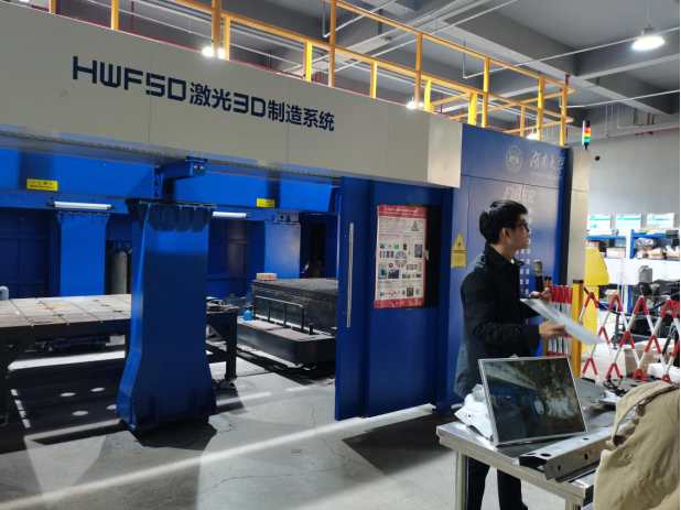 首先参观的是HWF50激光3D制造系统,该系统主要用于普通碳钢板、不锈钢板等材料的切割、焊接以及零件的激光增材制造,参观时正在进行激光切割复杂三维工件和激光增材制造大型件的研究工作。