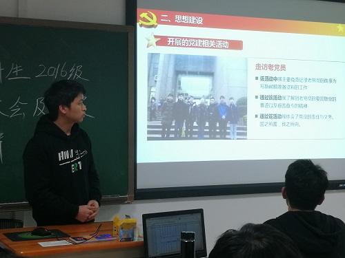 支部书记许多同志围绕发展对象答辩要求、党内小组分工及日常工作细则以及支部内存在的部分问题做出了详细阐述,随即展开了发展对象的入党答辩。本次答辩主要分为两个部分,首先由发展对象进行个人陈述,通过对入学以来的学习情况、思想情况、社会实践、入党动机到自身的优缺点进行详细地汇报,支部12名发展对象都准备得十分充足,每一位同志都尽力将自己最好最真实的的一面展现给大家。在个人陈述完成后,每位同学要回答支部成员提出的问题,其中包括党的理论、时势政治、社会热点及系列开放性问题。而针对这些问题,同学们也给出了精彩的回答。