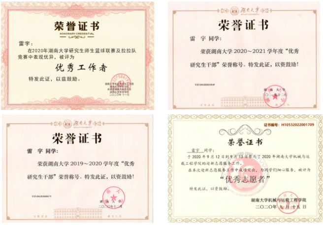 其次,他还积极参加学校或学院各类学术、文体活动,并取得了一定的成绩。他曾担任2019年-2021年机械院研究生男子篮球队领队兼队长,球队分别获得19年亚军、20年亚军以及21年冠军的好成绩。