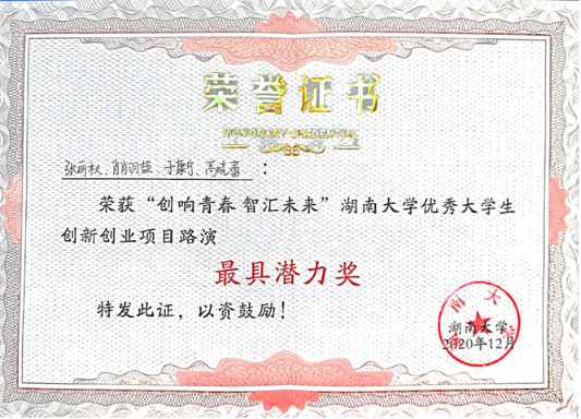 一等学业奖学金、2020-2021学年度“泰豪之星”二等奖学金、全国高校新能源汽车大数据创新创业大赛一等奖,现担任机械院研究生会副主席。