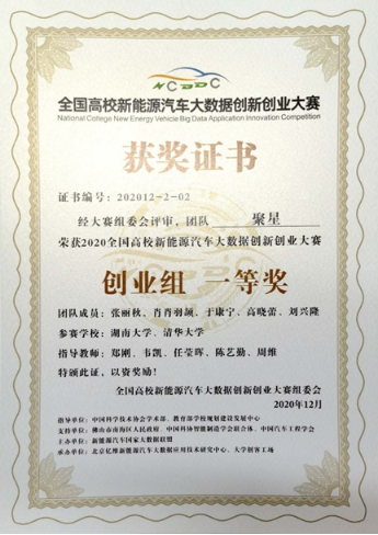 2020年全国高校新能源汽车大数据创新创业大赛一等奖证书