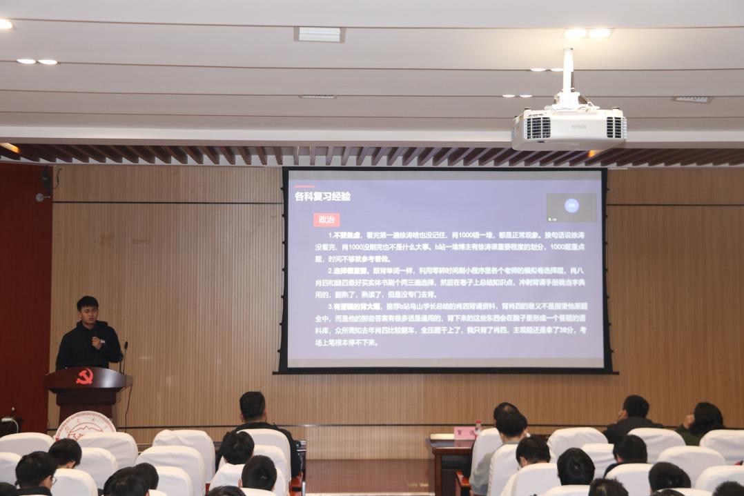 大会第二项,由李勇霖,方毅兵,崔潇川,王忻宇学长分享自己的考研心得,他们从复习技巧,考前准备,考试中注意事项,复试技巧等方面将自己经验传授给同学,告诉同学们考研是一场持久战,不能半途而废,每一份努力都是值得的。并且解答了同学们关于考研的各种疑惑。大会第三项,由辅导员李迪发言。李迪老师代表全体无码破解