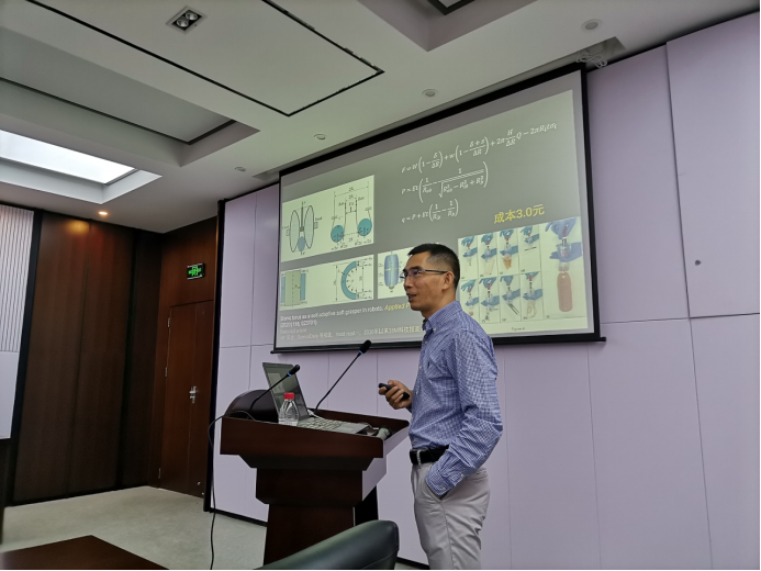 报告中,袁教授系统地讲解了压阻式复合材料的内部等效电路模型以及复合材料传感器的研制进展,详细地展示了表界面结构设计和反常摩擦。受植物叶片表面微结构的启发,设计了具有负摩擦特性的仿生结构,实现了宏观超滑摩擦副。另外,报告中还对自适应仿生机械手,柔性机械臂,可变形机翼,仿生机器鱼等前沿研究进行了详尽的介绍。同时也分享了其课题组关于环形弹性柱杆扭转失稳分析的最新研究进展。随后,袁教授就如何寻找科研想法以及如何激发学生的科研兴趣和潜能分享了自己的看法和经验。袁教授的讲解清晰,语言幽默,内容丰富,精彩纷呈,兼具深度与广度,赢得了在场师生们的阵阵掌声。报告最后阶段,与会师生就报告中的多处精彩研究内容与袁教授进行了热烈的学术交流与探讨。