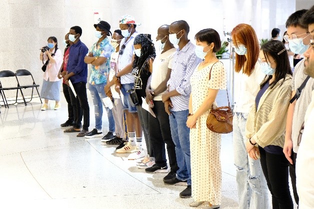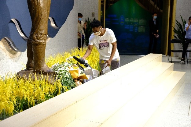参观临近结束时,留学生Rono博士非常想去参观实验田,他不满足于仅仅停留在认知上的感受,更想要了解杂交水稻的真实培育过程,湖南农大的两位学生带领他一起去探索了实验田,他们也因此建立了深厚的友情一粥一饭,当思来处不易;半丝半缕,恒念物力维艰。最后在袁隆平院士石像前,每位同学献上了鲜花并深深鞠躬来缅怀袁隆平院士。