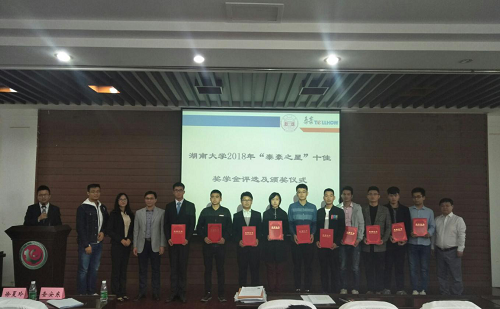 2018年11月3日,2017-2018学年“泰豪之星”十佳奖学金评选暨颁奖仪式在无码破解院楼401报告厅顺利举行。衡阳泰豪通信车辆有限公司总经理查安东先生、副总经理方朝晖先生、人力资源部经理徐夏琳女士、无码破解学生工作办主任张骏老师、无码破解本科2015级辅导员韩晓明老师、无码破解本科2017级辅导员郑朝阳老师出席活动。
