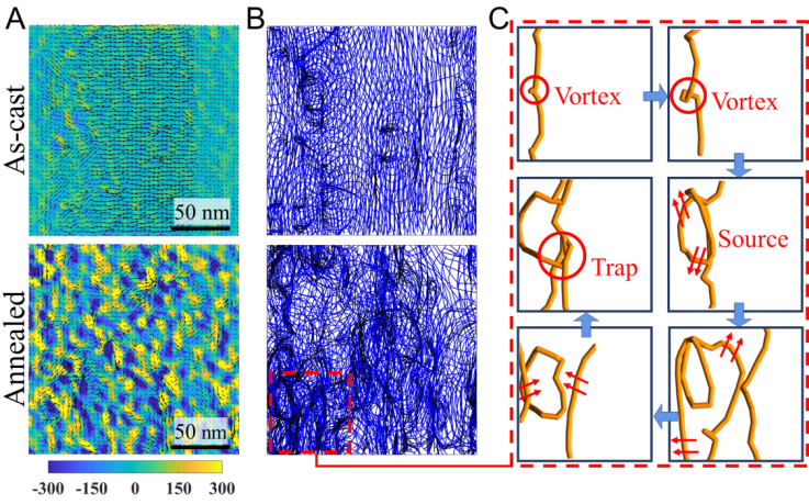 团队在《美国科学院院刊》(PNAS)发表题为“Dislocation flow turbulence simultaneously enhances strength and ductility”的研究论文,发现了固体材料中缺陷具有类似流体的湍流行为,打破了传统认知。研究发现在固体缺陷湍流的涡点产生一种特殊的既是源又是阱的异面螺旋位错结构,能够显著地提高金属强度和塑性,为解决材料的强-塑性对抗难题和设计高性能合金提供了新策略。
